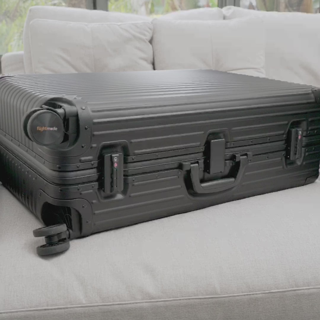 The Flightmode Suitcase (Large) is designed for long journeys, extended vacations, and travellers who pack big. With a generous 86L capacity, this spacious suitcase holds everything you need with room to spare. Its high-end anodised aluminium shell ensures lasting durability and lightweight performance, while dual TSA-approved latch locks provide maximum protection. Reinforced wheel structures and smooth 360° double spinner wheels make travel effortless through airports, stations, and hotels. Inside, divider pads keep your belongings neatly organised — reliable, elegant, and built to last.